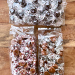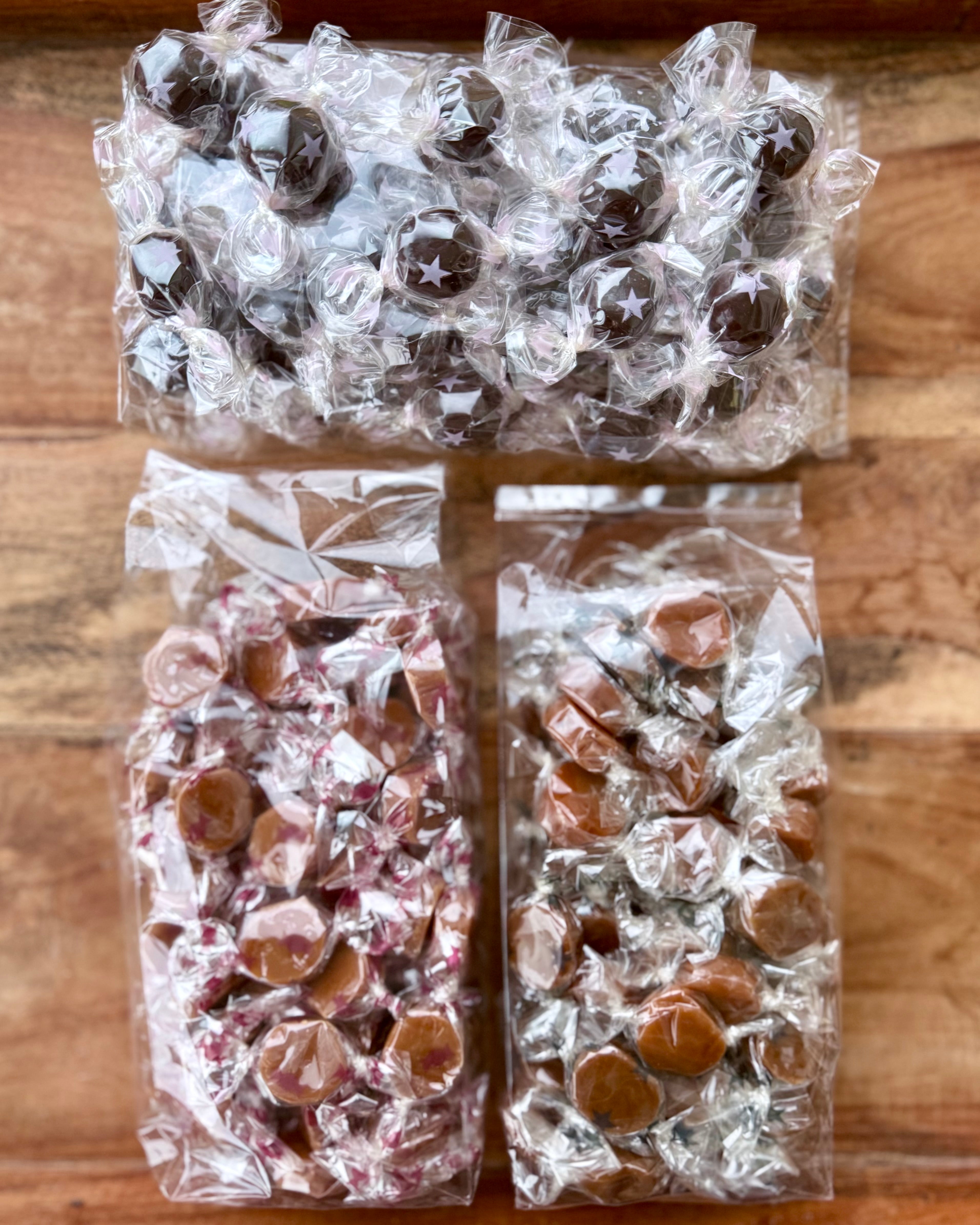 Denne pakke indeholder karameller og karamelkugler i poser á 300g: