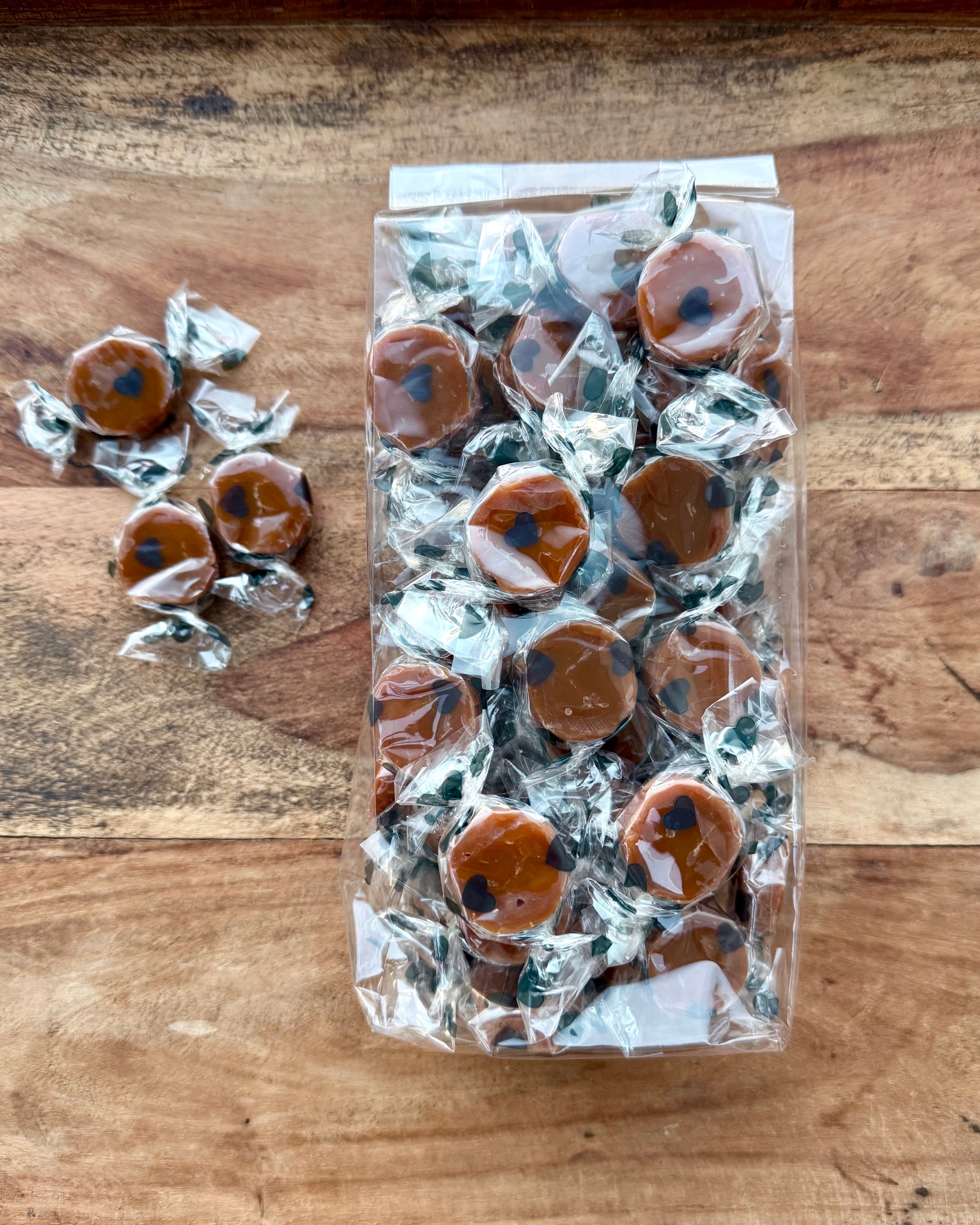 Denne pakke indeholder følgende karameller og karamelkugler i poser á 300g