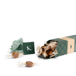 Our new boxes are plastic-free, made from FSC-certified materials – and the caramels are wrapped in compostable cellophane, with OK Compost Home certification. Remember to sort waste according to your local options.